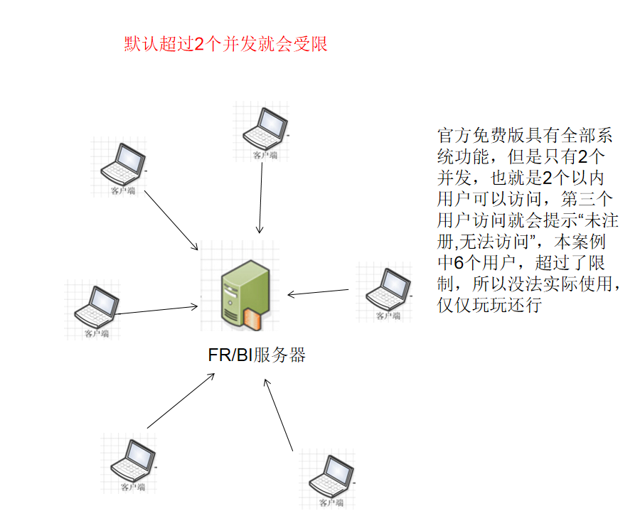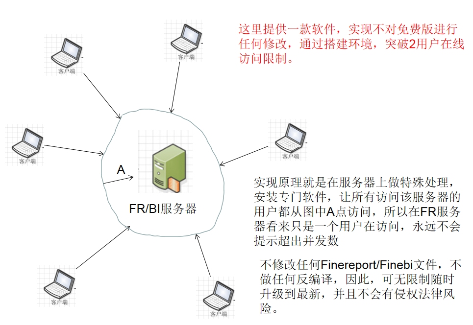 实现原理就是在服务器上做特殊处理,安装专门软件,让所有访问该服务器的用户都从图中A点访问,仅仅是对服务器进行部署,并非修改了FR或者BI软件本身,所以在FR服务器看来只是一个用户在访问,永远不会提示超出并发数