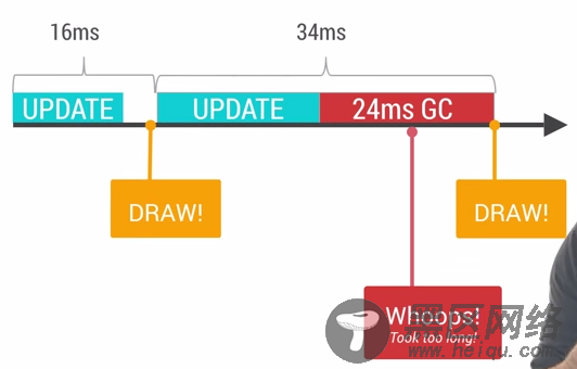 通常来说,单个的GC并不会占用太多时间,但是大量不停的GC操作则会显著占用帧间隔时间(16ms)。如果在帧间隔时间里面做了过多的GC操作,那么自然其他类似计算,渲染等操作的可用时间就变得少了。