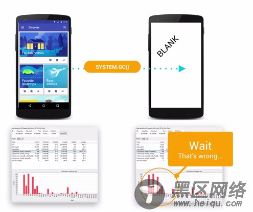寻找内存泄漏并修复这个漏洞是件很棘手的事情,你需要对执行的代码很熟悉,清楚的知道在特定环境下是如何运行的,然后仔细排查。例如,你想知道程序中的某个activity退出的时候,它之前所占用的内存是否有完整的释放干净了?首先你需要在activity处于前台的时候使用Heap Tool获取一份当前状态的内存快照,然后你需要创建一个几乎不这么占用内存的空白activity用来给前一个Activity进行跳转,其次在跳转到这个空白的activity的时候主动调用System.gc()方法来确保触发一个GC操作。最后,如果前面这个activity的内存都有全部正确释放,那么在空白activity被启动之后的内存快照中应该不会有前面那个activity中的任何对象了。