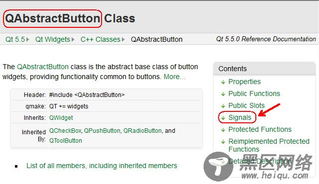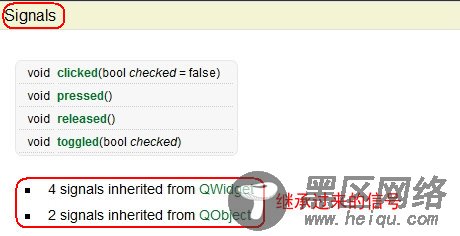 a)在 QPushButton 类中不能直接查看 Signals 的信息,需要在其基类“QAbstractButton ”中查找: