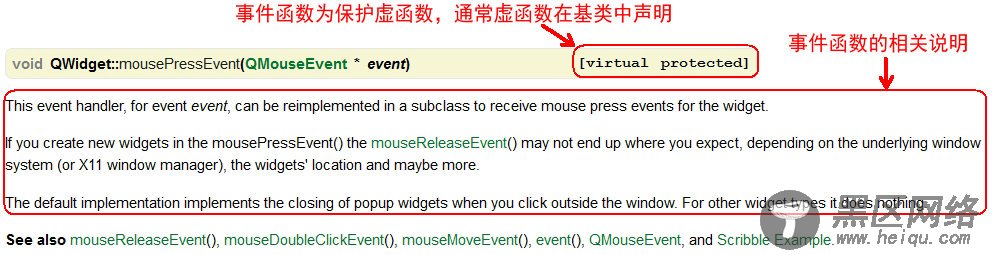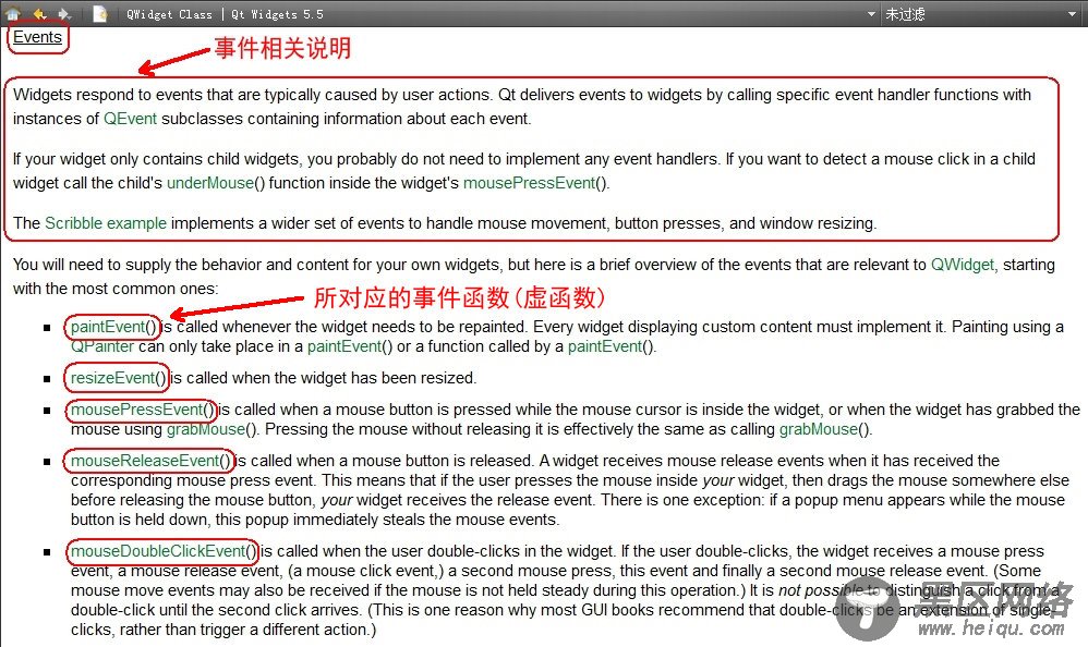 部件常用事件主要在 QWidget 中声明,选择“Events”即可查看相关说明: