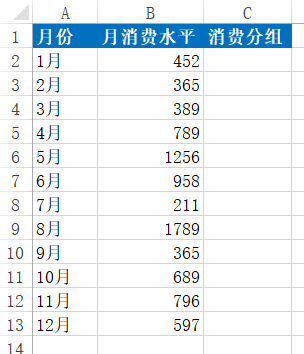 我们现在有这样一组数据,我们想要通过他们的月消费水平将他们的消费分组(低消费、中消费、高消费)