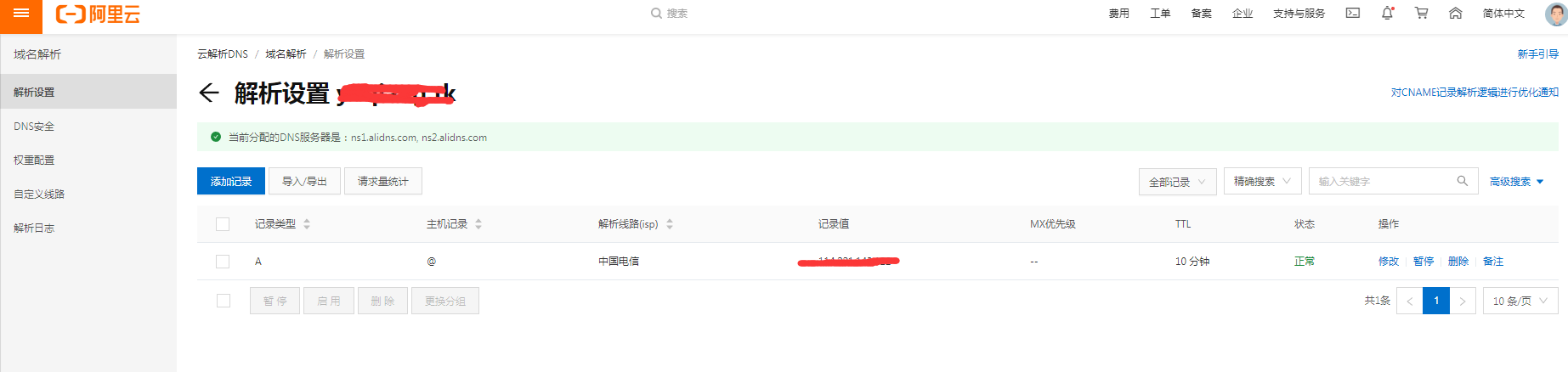 从阿里云处获取DNS,先添加域名,然后鼠标悬浮在第三列上就会出现如下图的DNS地址,填写写到上图就可以了